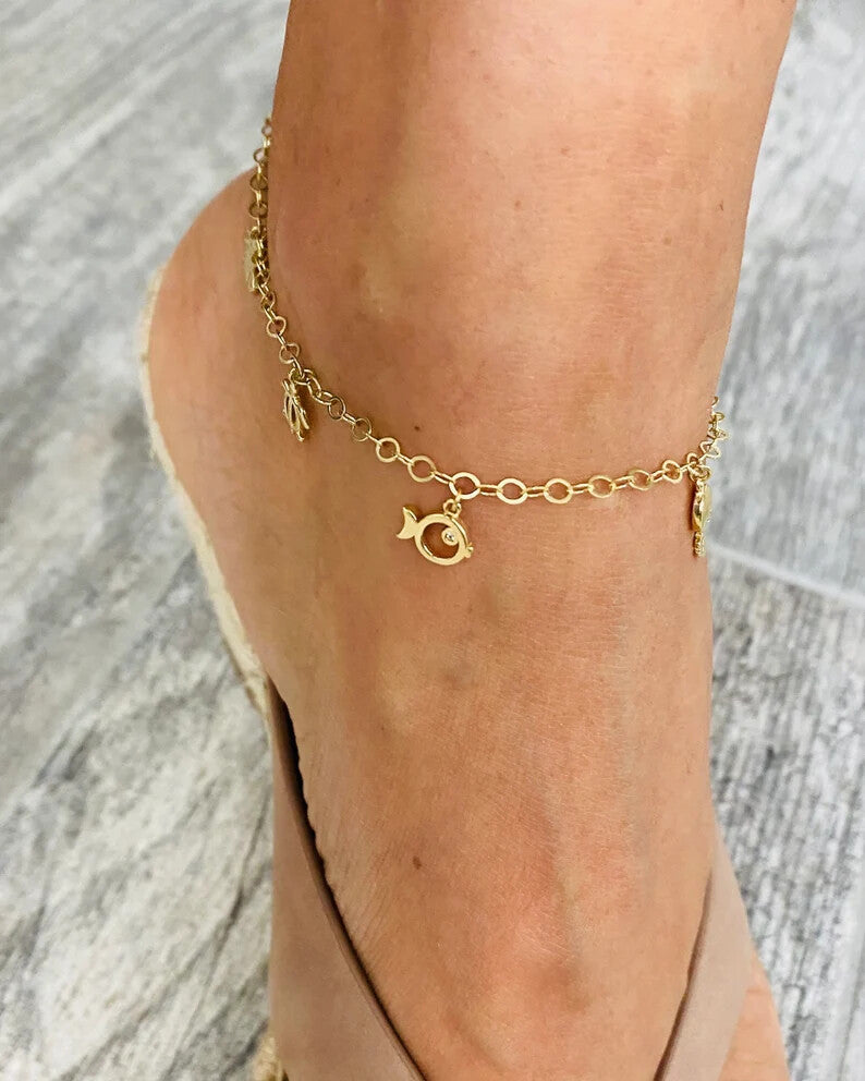 14K Solid Real Gold Anklet Bracelet. ( 9" + 1" ) Adjustable, Beautiful, delicate anklet bracelet. 2.5 mm thick open/ round chain link anklet bracelet. 14K Solid Gold Charm: Butterfly, Bees, Sea turtle, Goldfish, Key, Umbrella, Star pin.