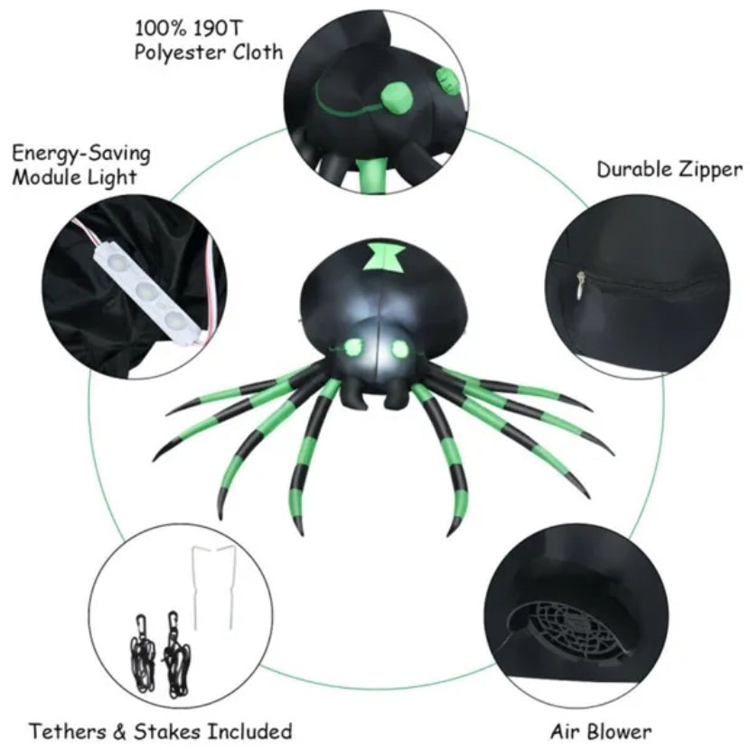 ● 간편한 설치 및 보관: 모든 설치 액세서리가 포함되어 있어 설치 단계가 간단하여 시간을 절약할 수 있습니다. 또한, 컴팩트한 크기와 가벼운 무게 덕분에 팽창식 거미는 보관이 매우 간편합니다. 할로윈이 끝날 때까지 기다렸다가 지퍼를 열어 공기를 모두 빼고 구석에 보관하세요.