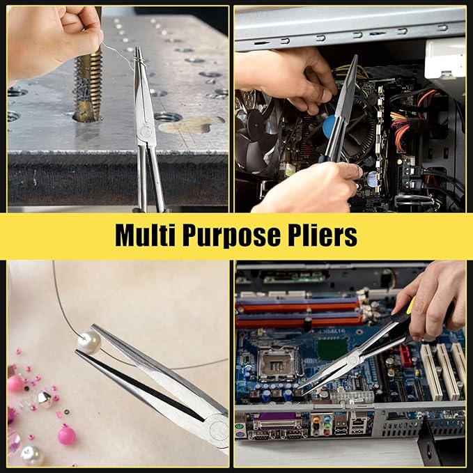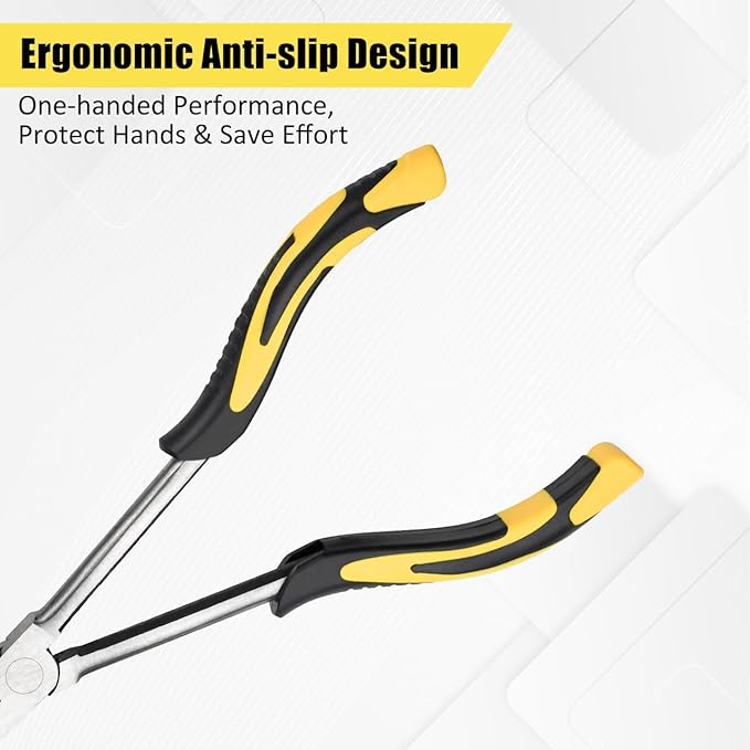 - 【Premium Materials】The needle-nose pliers body is forged from high-quality chrome-vanadium steel, while the handles are crafted from eco-friendly TPR material. This 11-inch long-nose pliers set is specifically designed for mechanical installation and maintenance, automotive and motorcycle repairs, enabling precise maneuvering around obstacles, gripping minute components, and performing intricate operations