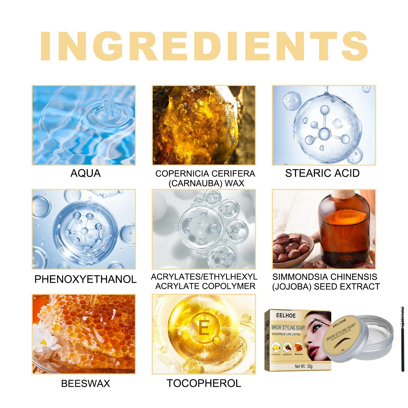 당사의 눈썹 크림에는 비타민 E, 호호바 오일, 밀랍이 함유되어 있습니다.