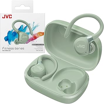 JVC Fitness Series True Wireless Sport Earbuds with Adjustable Hooks, Active Noise Cancelling, Ambient Sound Mode, IP57 Waterproof, 40hr Long Battery Life, App EQ, Low Latency, Mic HAEC75TG Green
