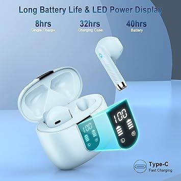 - 40Hrs Battery Life & Digital LED Display: The battery capacity of these bluetooth earbud allows you to enjoy your music and calls for hours on end. With a fully charged battery, our wireless headphones bluetooth provide up to 8 hours of continuous playtime. The portable charging case extends the total playtime to a remarkable 40 hours. The Type-C charging port ensures faster and easier charging. The built-in digital LED screen displays the remaining battery percentage of the charging case in real-time, and the LED indicator bar shows the charging status of each earbud.