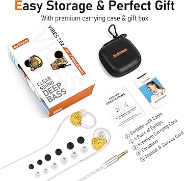 - What's in the Box: Vibes 202 HiFi wired earbuds with silver-plated cable, 6 pairs of eartips, carrying case, carabiner & user manual.