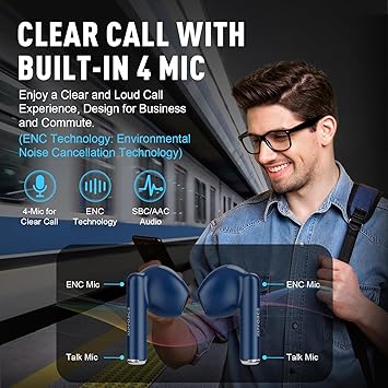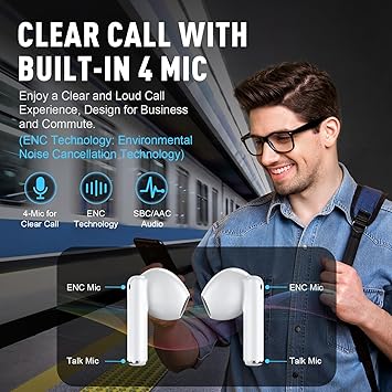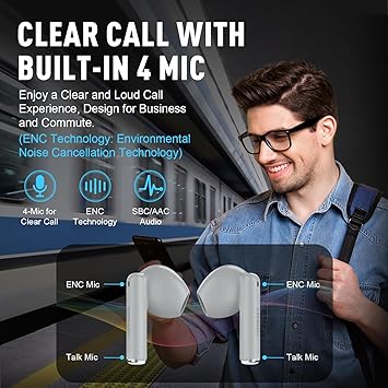 - 【4-Mic and ENC Call Noise Reduction】: Each headset has 2 built-in microphones, equipped with Environmental Noise Reduction (ENC) technology that can suppress 80% of the interfering background noise in the calling environment, intelligently enhances human voicethrough the four microphones, the wireless headphones accurately pickup voice and offer effective noise isolation achieving lossless and clear voice calls between the two parties, making communication more efficient.